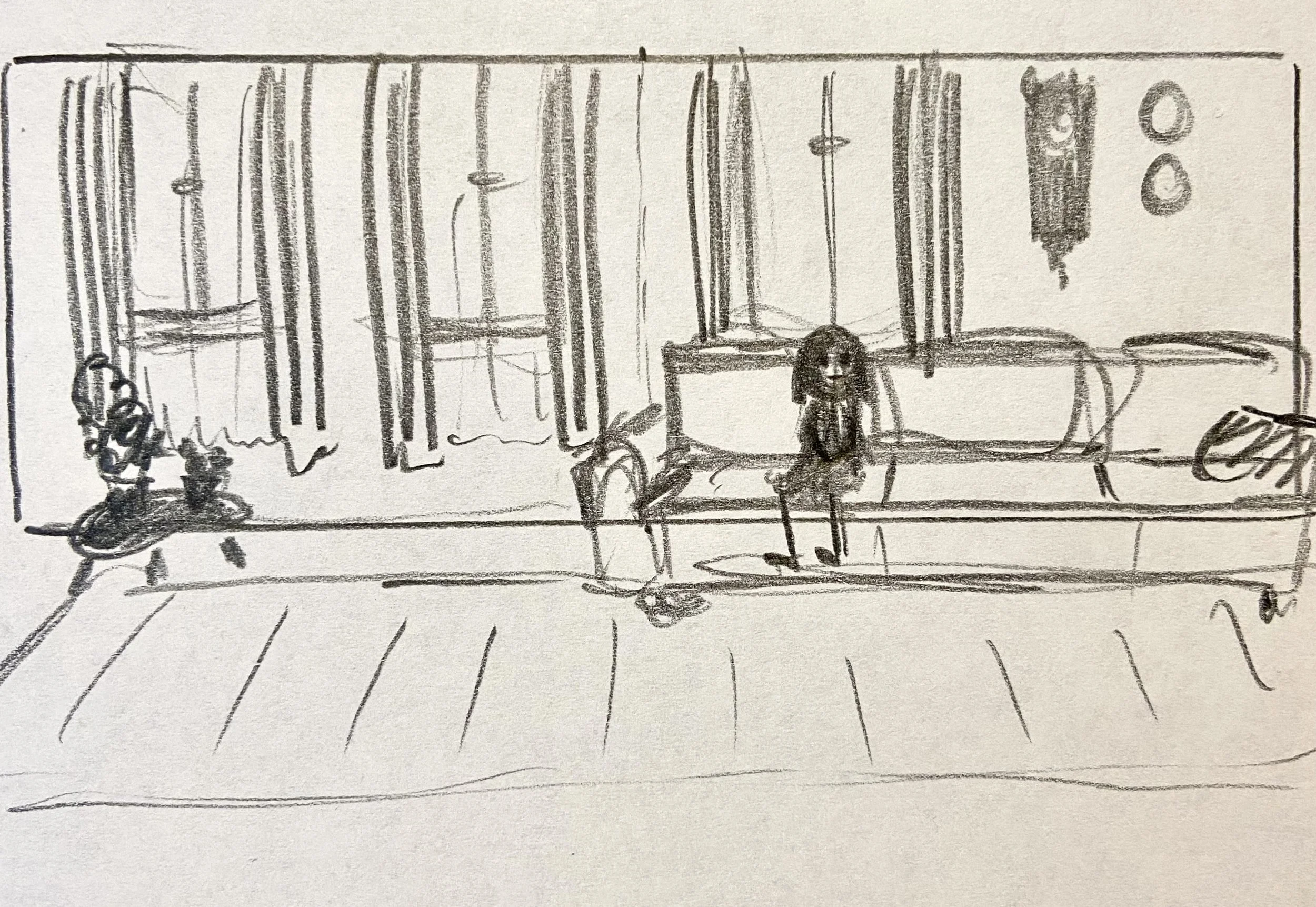 The sketch: I take a picture of my thumbnail with my phone, and use it as the base for a digital drawing. This drawing is still quite loose, but it is the same size as the finished illustration will be. It‘s not supposed to be a perfect, detailed drawing, just enough to communicate the image more clearly. I can also show a sketch like this to other people to get some feedback.