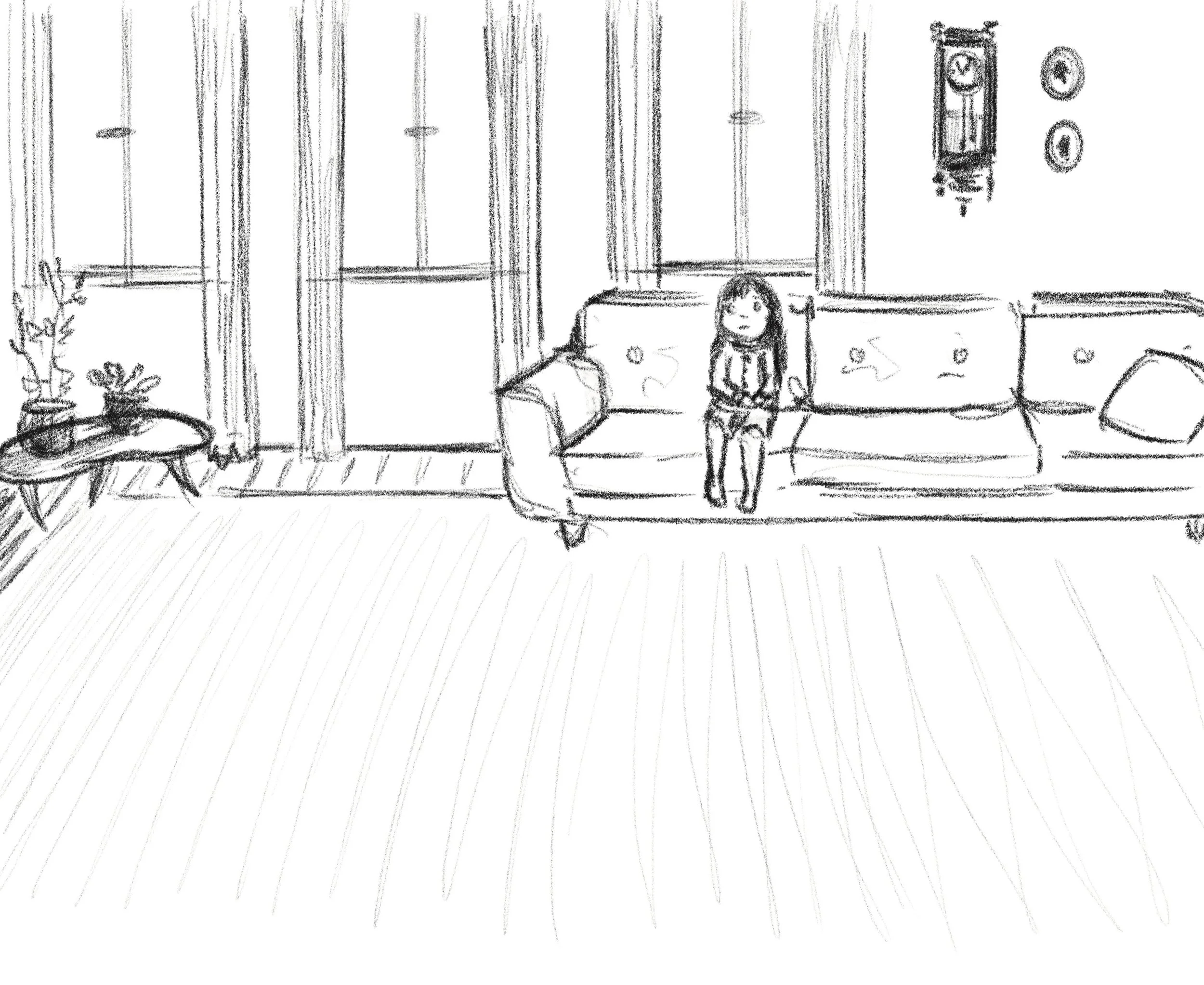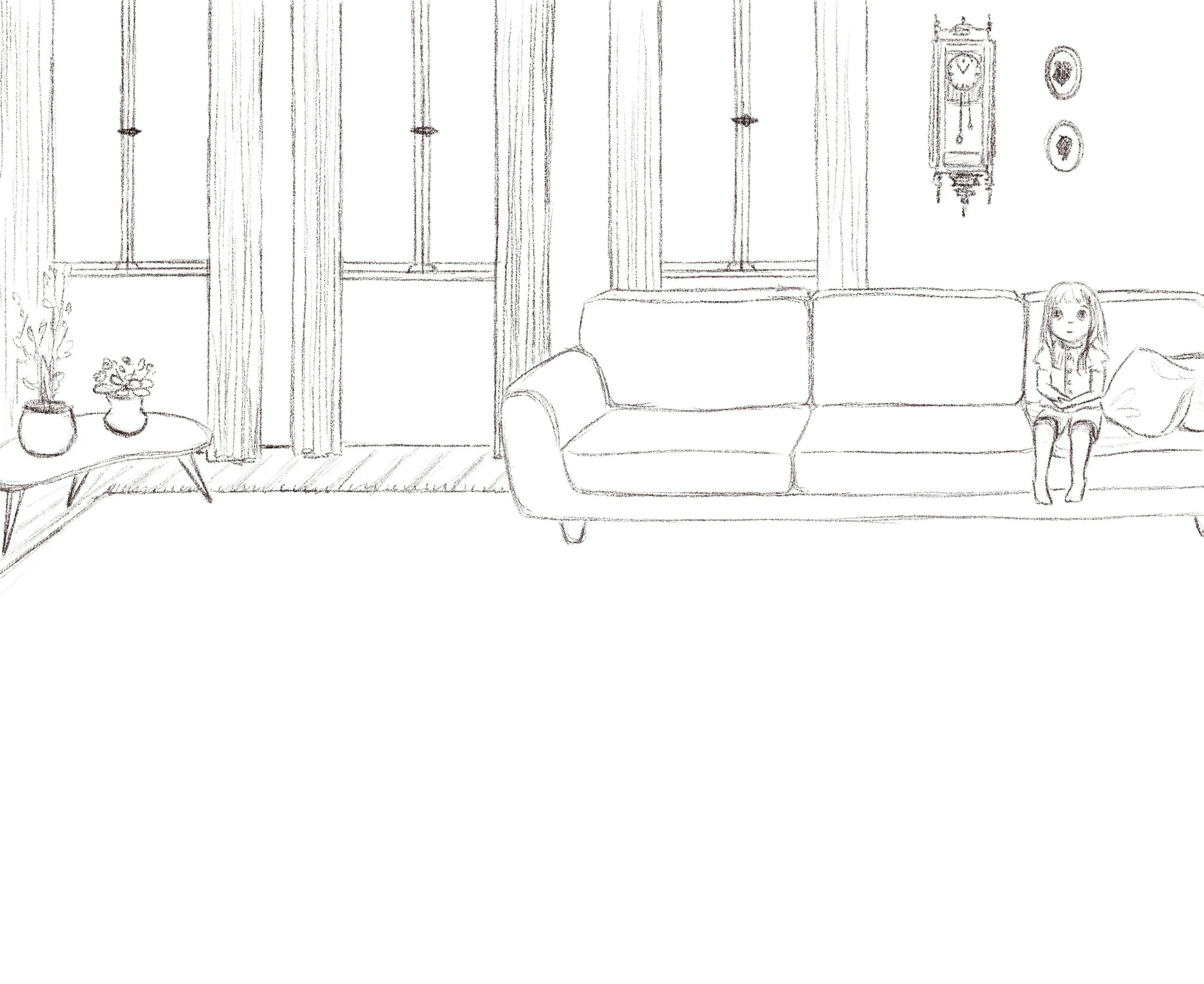 The line drawing: Last chance to make some changes! In this case, my lovely agent Sarah suggested moving the girl to the right, to make the room feel even more empty. Switching to digital for the sketching and drawing phase allows me to put important elements on different layers, so I can move them around if needed. If the final image is going to have very complex lighting, I would have done a value study before making the drawing. Here, the lighting was quite simple, so I skipped that step. The drawing has now lots of little details, and I only move forward once I‘m satisfied everything is exactly in the place I want it to be.